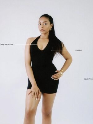 - Long-line halter tank with a daring and bold deep front line cut.